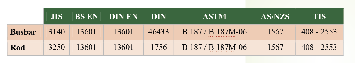 Copper busbar and rod are produced to meet International Standards including JIS, BS EN, DIN EN, DIN, ASTM, AS/NZS and TIS as required by customer specifications.